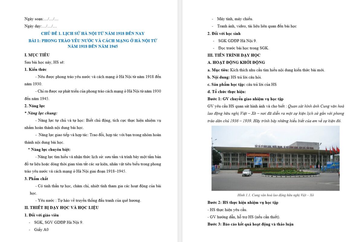Giáo dục địa phương Hà Nội 9 được xây dựng dựa trên tài liệu hướng dẫn nội dung giáo dục địa phương lớp 9 đã được phê duyệt của Sở Giáo dục và đào tạo. Giáo án gồm các chủ đề thuộc phân môn Địa lí, Lịch Sử, Ngữ Văn, Âm nhạc, Sinh học, Mĩ thuật…. với các nội dung tìm hiểu về thành phố Hà Nội. Giáo án được soạn chi tiết, đầy đủ cả năm, theo mẫu giáo án công văn 5512. Để xem đầy đủ giáo án, mời các thầy cô ấn nút “Tải giáo án” để tải giáo án đẩy đủ cả năm môn Giáo dục địa phương Hà Nội lớp 9.