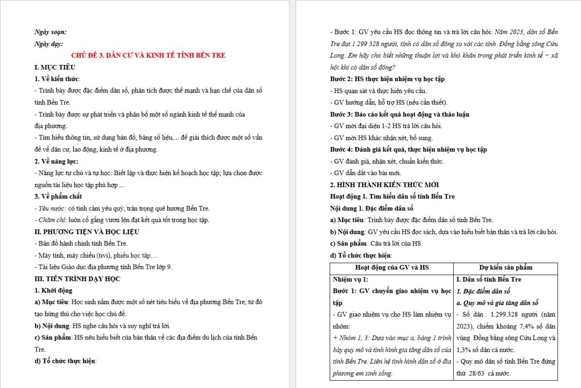 – Trình bày được đặc điểm dân số, phân tích được thế mạnh và hạn chế của dân số tỉnh Bến Tre.
