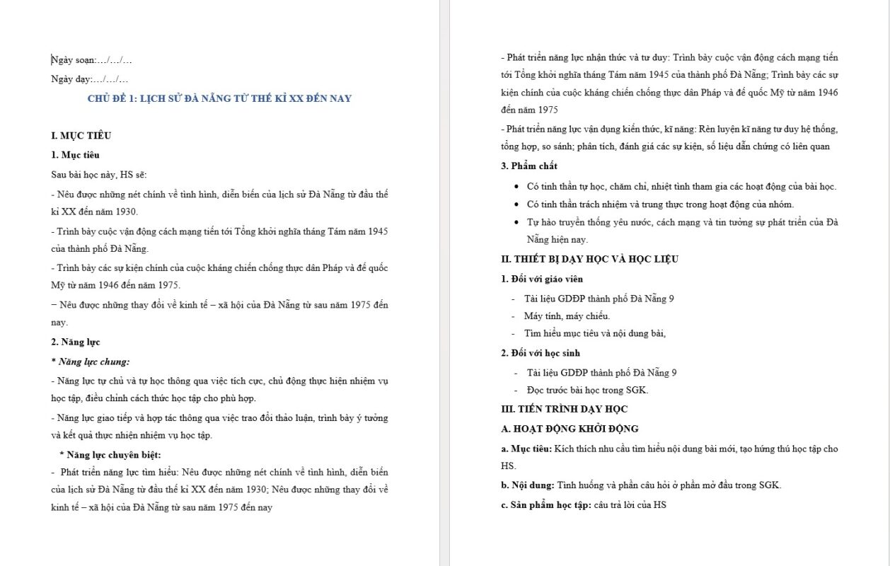 Giáo dục địa phương Đà Nẵng 9 (Sau sáp nhập) được xây dựng dựa trên công văn hướng dẫn kết hợp Đà Nẵng với Quảng Nam của Sở Giáo dục và đào tạo. Giáo án gồm các chủ đề thuộc phân môn Địa lí, Lịch Sử, Ngữ Văn, Âm nhạc, Sinh học, Mĩ thuật…. với các nội dung tìm hiểu về thành phố Đà Nẵng. Giáo án được soạn chi tiết, đầy đủ cả năm, theo mẫu giáo án công văn 5512. Để xem đầy đủ giáo án, mời các thầy cô ấn nút “Tải giáo án” để tải giáo án đẩy đủ cả năm môn Giáo dục địa phương Đà Nẵng 9