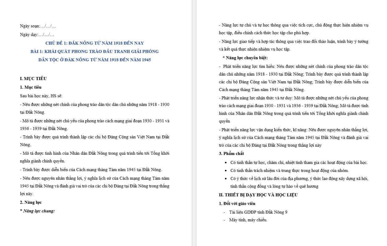 – Phát triển năng lực nhận thức và tư duy: Mô tả được những nét chủ yếu của phong trào cách mạng giai đoạn 1930 – 1931 và 1936 – 1939 tại Đắk Nông; Mô tả được tình hình của Nhân dân Đắk Nông trong quá trình tiến tới Tổng khởi nghĩa giành chính quyền
